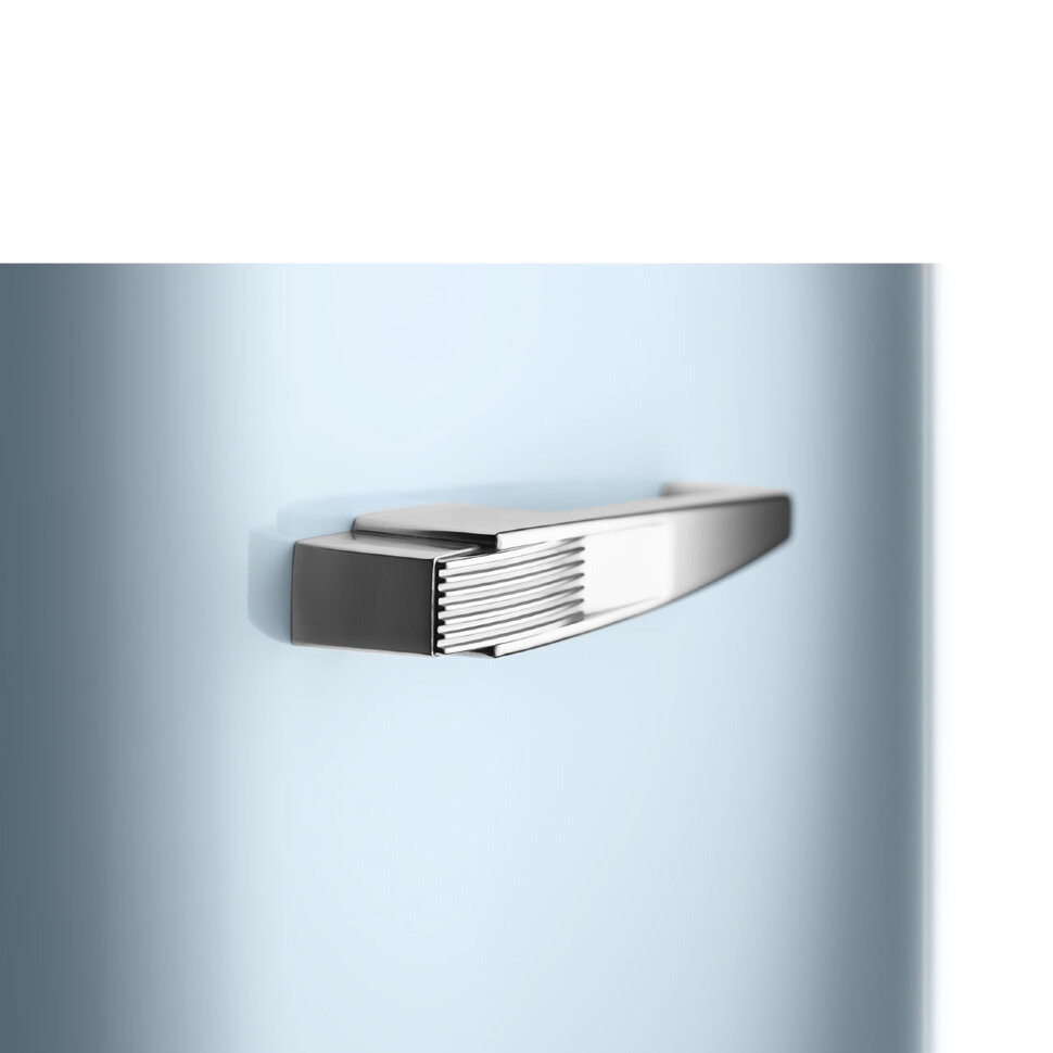 Дверца выполнена из термоформируемого полимера, боковые стенки - из стали, регулируемые полки - из стекла. Цвет ручек, профиля на полках дверцы, профиля на выдвижных ящиках и профиля на стеклянных полках - хром, цвет боковых стенок - пастельный голубой.